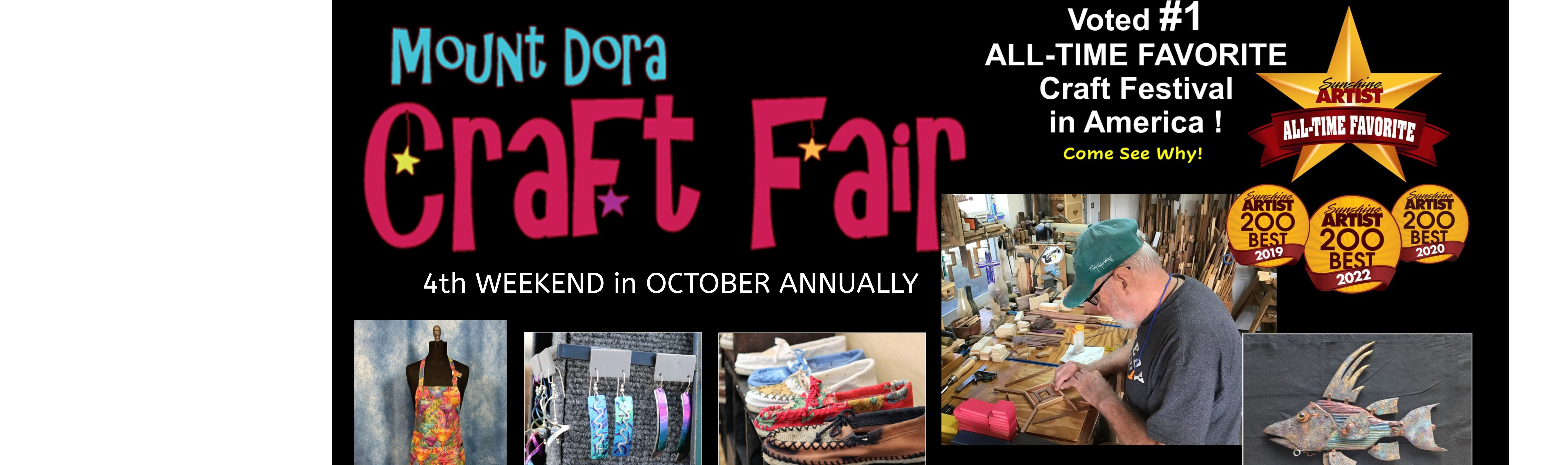 Consistently ranked in the Top 10 BEST by Sunshine Artist Magazine in their annual ranking of the Best Classic/Contemporary Craft Festivals in America, the Mount Dora Craft Fair was awarded the title of ALL TIME FAVORITE #1 in their special 50th Edition published in 2021.
